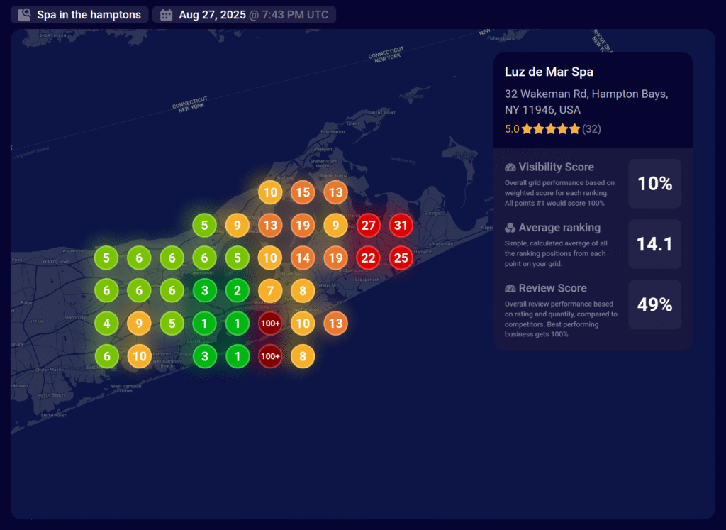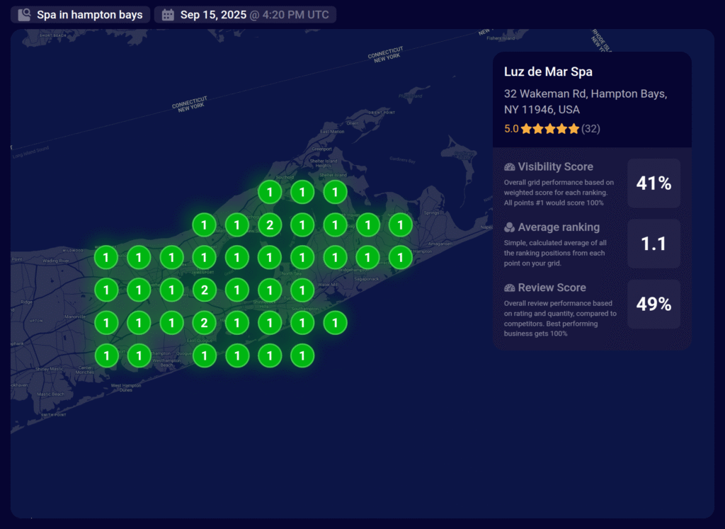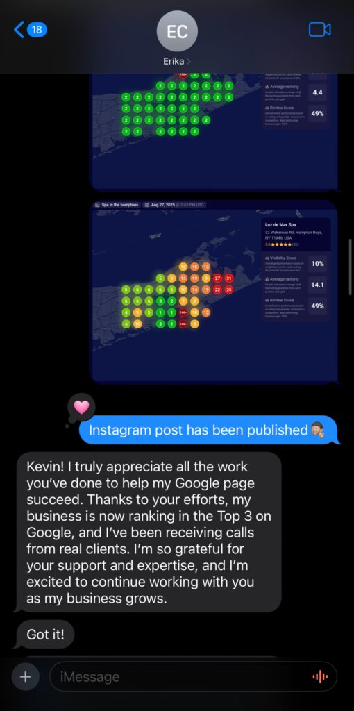 As a brand-new business in Hampton Bays, Luz de Mar Spa needed to build visibility fast. Within just one week of working with us, they ranked in the Top 3 Google Local Pack for their services, bringing in a flood of new clients. What’s more, many of these first-time visitors became loyal, repeat customers, giving the spa a strong base of recurring revenue and steady growth from the very beginning.